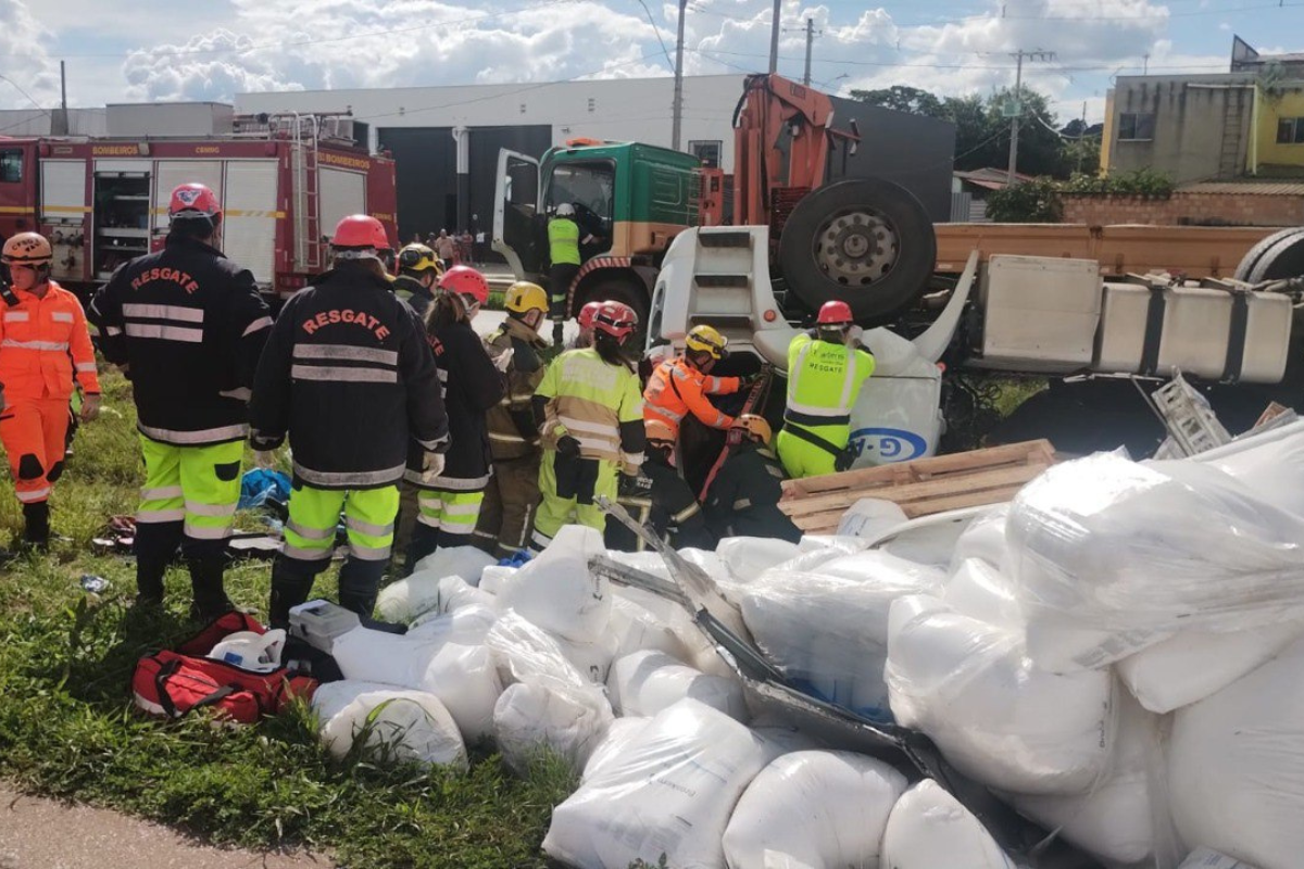 Um homem ficou preso às ferragens após perder o controle do caminhão que conduzia. O acidente aconteceu por volta das 14h30 deste sábado (28/2) no Contorno de Betim, na altura do bairro Granja São João.
